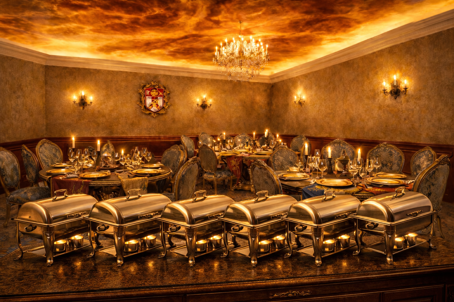 Der Bankettsaal inszeniert die Atmosphäre eines historischen Ratssaales der Handelsstadt Görlitz. Kerzenlicht, warme Lichtstimmung und dekorative Wappen- und Tischarrangements schaffen ein authentisches Ambiente für Gruppen, Touristen und Veranstaltungen.